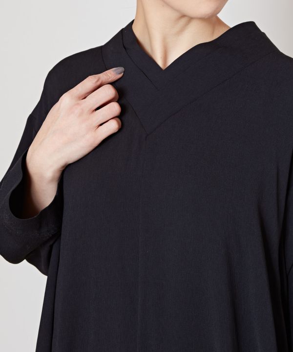 着物のような襟合わせのデザインが上品さを引き立てつつ、正面は無地のため、普段使いにもぴったりです。