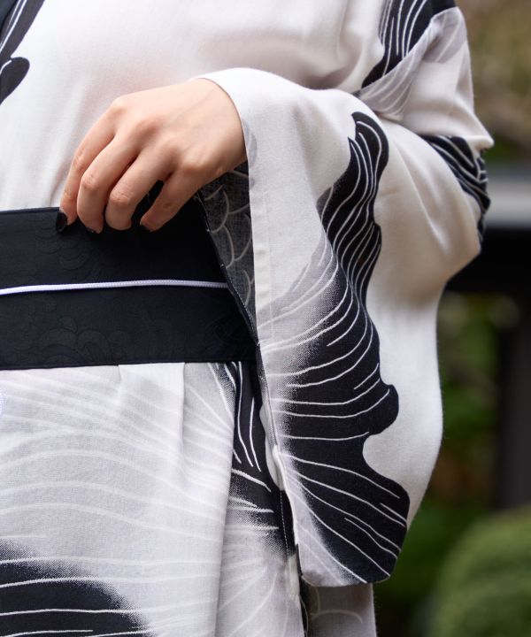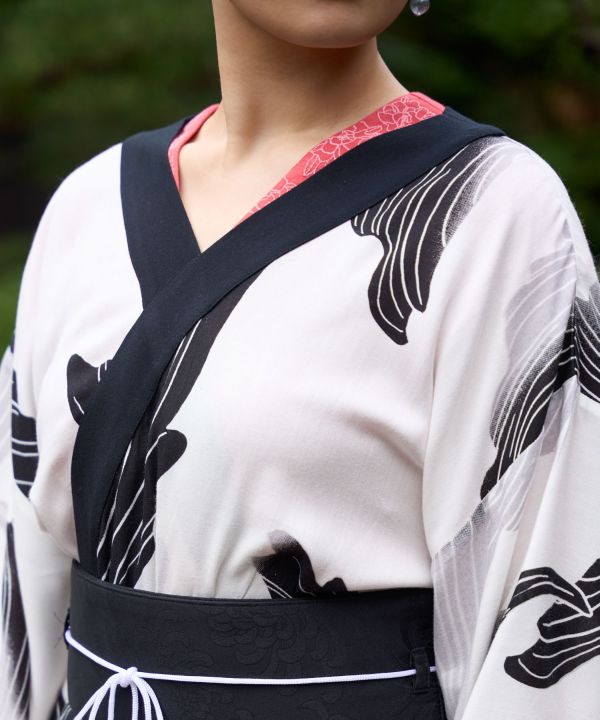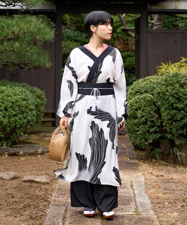 大きめな袖が特徴的で、ゆかたにならった型が一枚羽織るだけで気軽に和装も楽しめます。