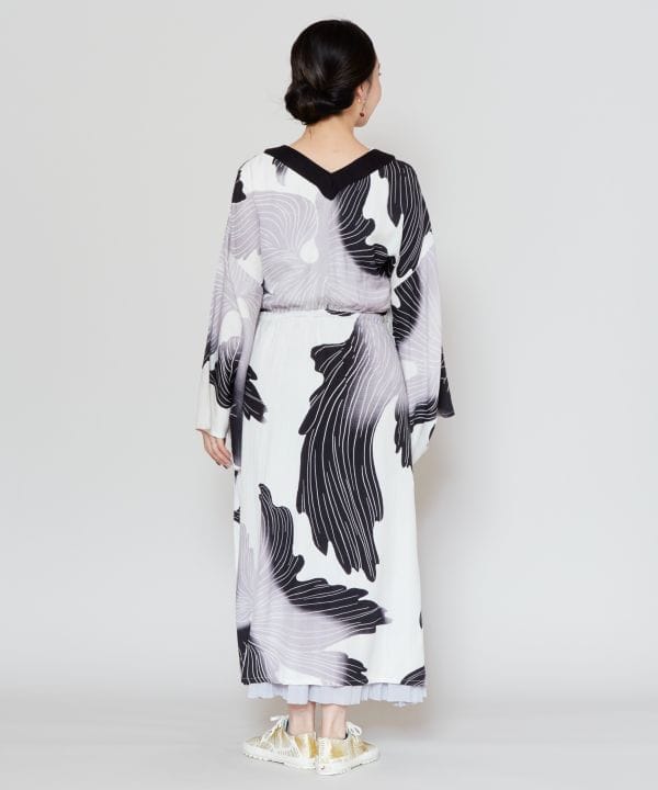 優雅にたゆたう金魚を大胆にあしらったデザインが目を惹くワンピース。