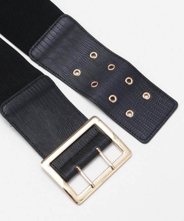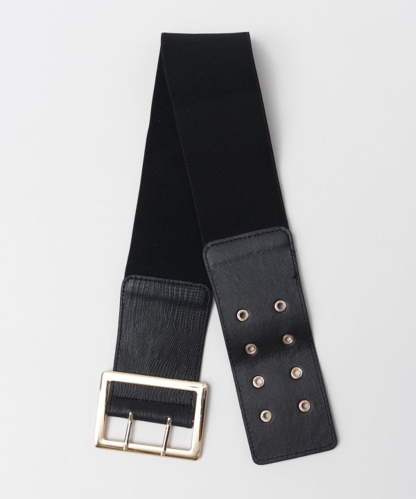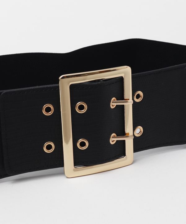 大ぶりなバックルが印象的な合皮レザー帯ベルト。